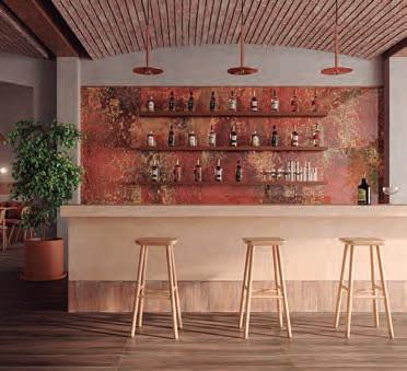 Inspirada nesse material, a ROCA apresenta diversos modelos de porcelanatos. A partir da tecnologia de impressão HD, oferece uma grande variação de desenhos e padrões entre as peças, per mitindo composições que se assemelham ao processo natural de oxidação do aço corten. Intensa e vibrante, a linha Red Stone traz a textura marcante das superfícies oxidadas e desgastadas pelo tempo. Os projetos ganham um ar de ousadia devido ao brilho in tenso da linha, que conta ainda com bordas retificadas e dimensão de 90X90cm. E a série Fire, em formato lâmina, 120x250cm, re produz com perfeição todas as peculiaridades do corten e reações ao tempo, imprimindo ares de desgaste natural.