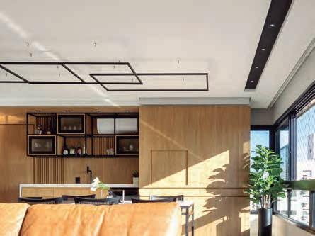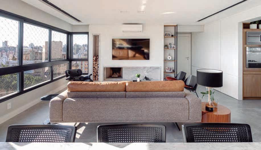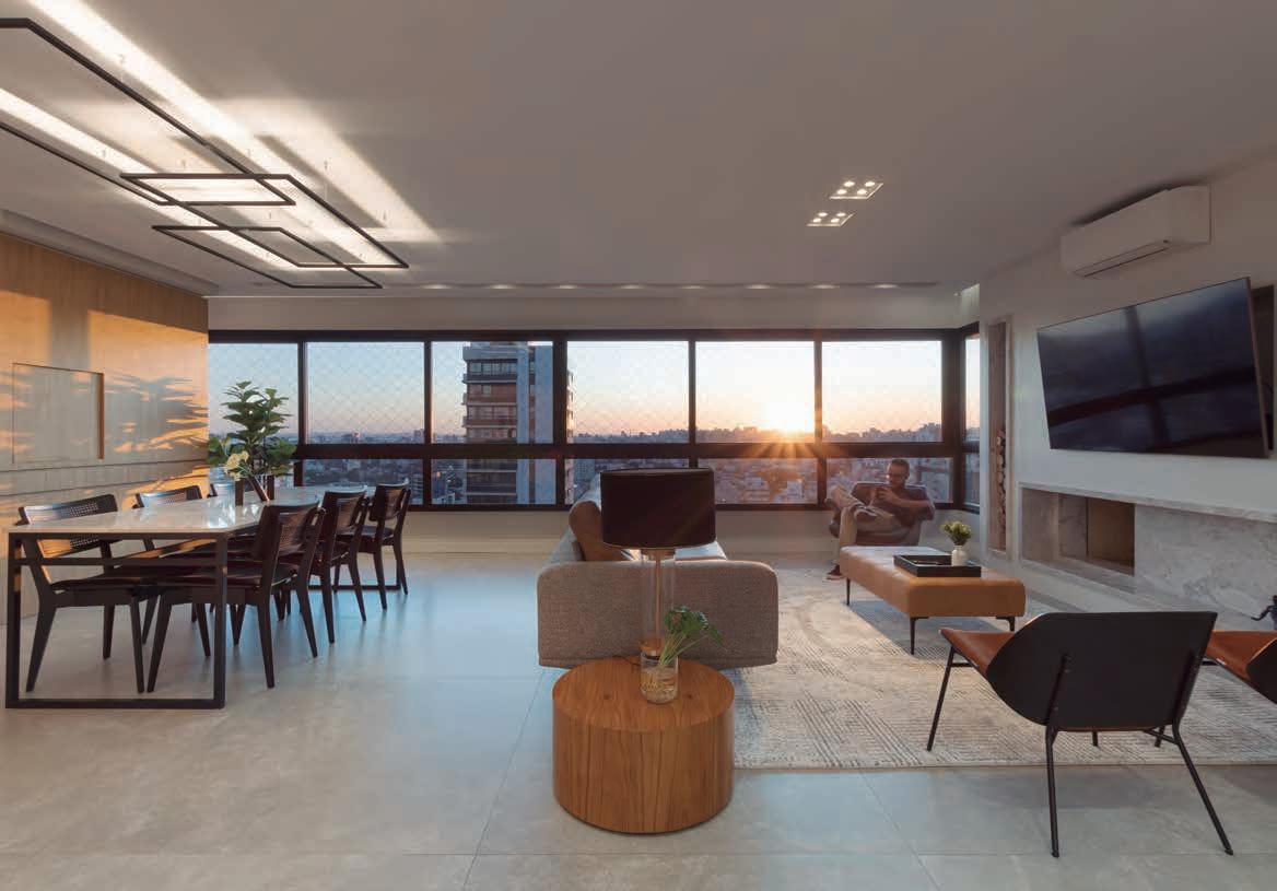 Definido por sua vista espetacular da cidade de Porto Alegre, este apartamento – mes mo sendo novo e com uma boa planta – foi submetido a uma reforma para atender às expec tativas da família em busca de melhores espaços para a convivência social e o dia a dia com o filho pequeno. Para isso, a dupla de arquitetos retirou pa redes, trocou detalhes do gesso, modificou pontos hidráulicos e elétricos, com a finalidade de integrar ambientes e torná-los mais acolhedores, repensan do os espaços sociais e propondo uma marcenaria moderna e funcional.