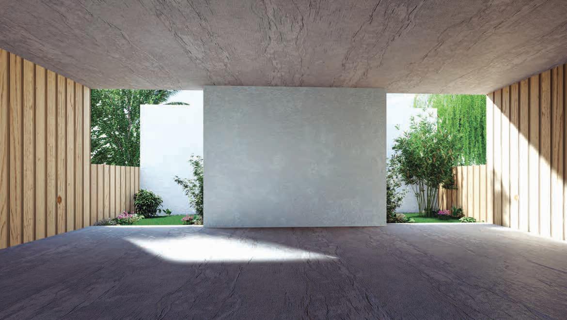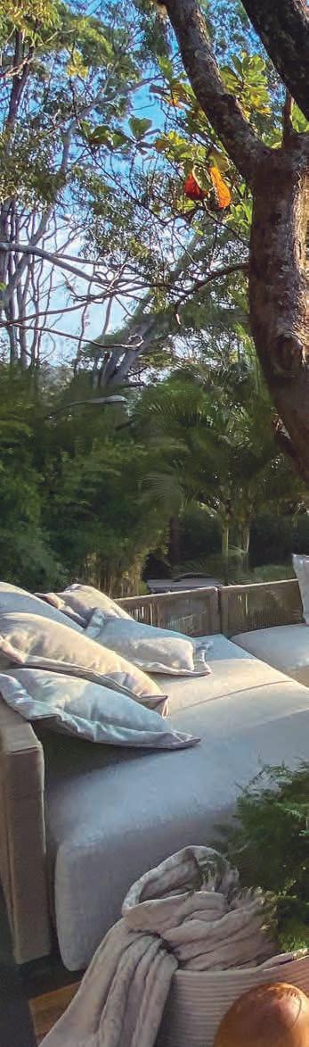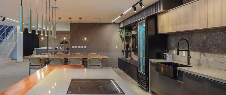 Odesafio arquitet nico do projeto desta área de lazer foi criar um espaço amplo que interligasse o exterior com o espaço gourmet da residência. As arquitetas montaram uma cozinha funcional revesti da com porcelanato cimentício e com o Adobe Moss na cor sertão, trazendo a presença simbólica de elementos naturais para o interior da casa.