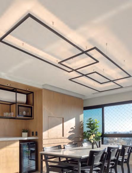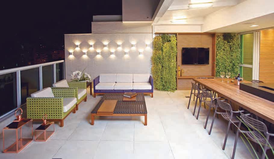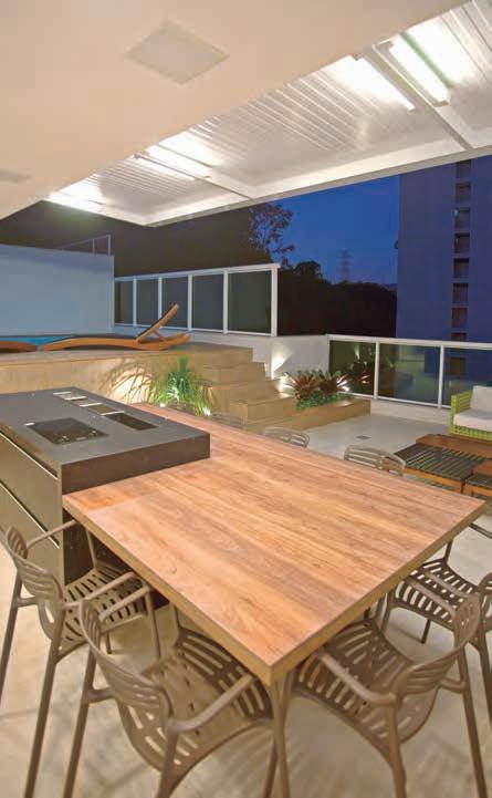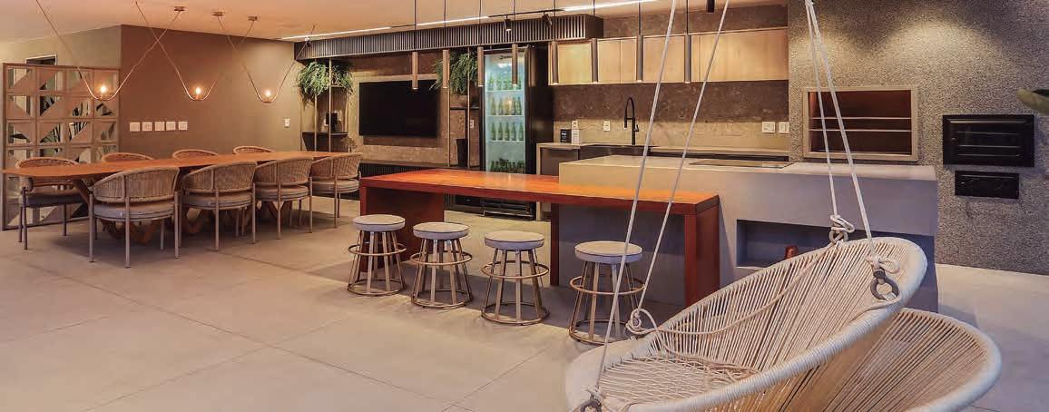 que, como um monobloco, divide e ao mesmo tempo integra os es paços. Outro destaque é o reves timento Moema, que logo no pri meiro contato visual se destaca e alegra a área de lazer.