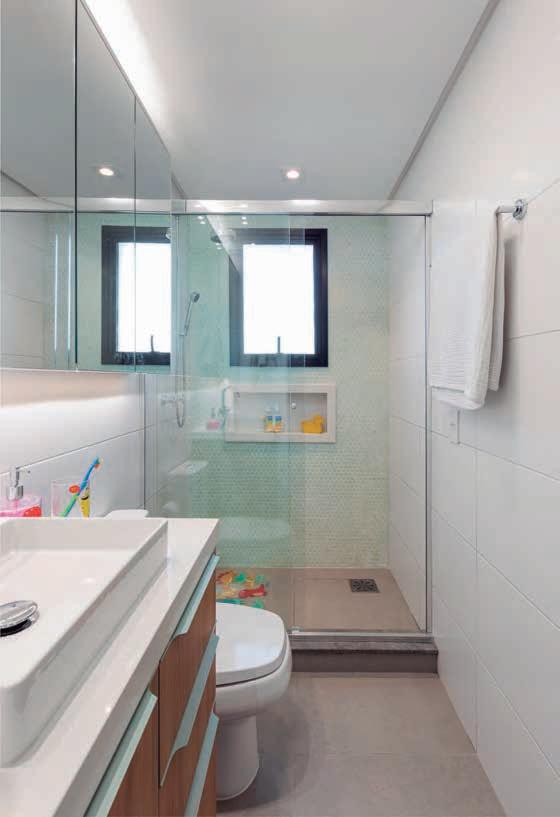 No banheiro do filho foi feita uma combinação do tom verde-menta da pastilha de porcelana e lissa exagonal com os puxadores do móvel, que, além de propiciarem uniformidade estética, valori zaram a vocação infantil do espaço.