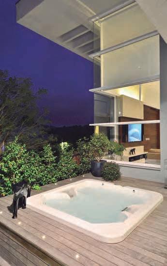 onde irrompem três jatos d’água – torna o ambiente ainda mais agradável. A piscina, que recebeu a pastilha Atlantis em tom azul esverdeado, 20x20cm, é aque cida, o que permite o seu melhor aproveitamento em várias esta ções do ano.