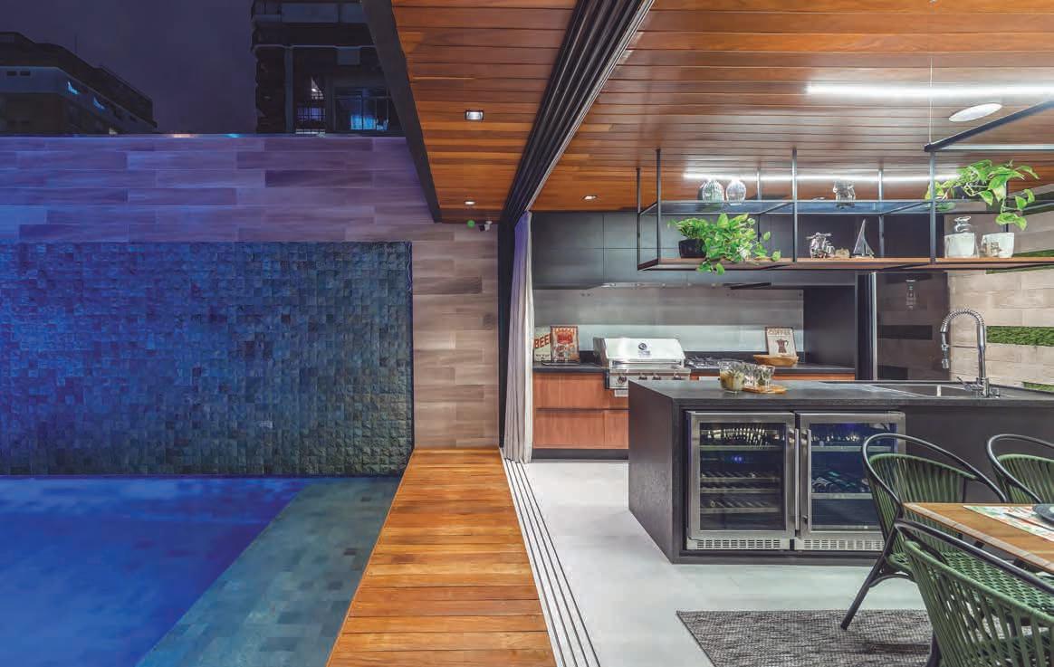Na nova edícula pode-se ob servar a utilização do forro vinílico no teto do segundo pavimento. Internamente, o piso escolhido para a área gourmet foi o Tribeca Gre acetinado retificado hard, no tamanho 120x120cm. Já na parede do fundo foi usado o re vestimento Iseo Grigio. A cuba e o misturador monocomando, ambos em inox Black Matte, se destacam no ambiente.