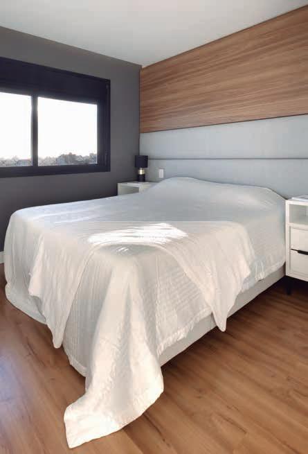 Com o intuito de realçar as dimensões do imóvel, foi escolhido o piso olmen Gre , 12 x 12 cm, para toda a área social, enquanto na área íntima os profissionais preferiram exaltar o calor do tom e do toque do piso vinílico.