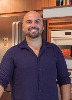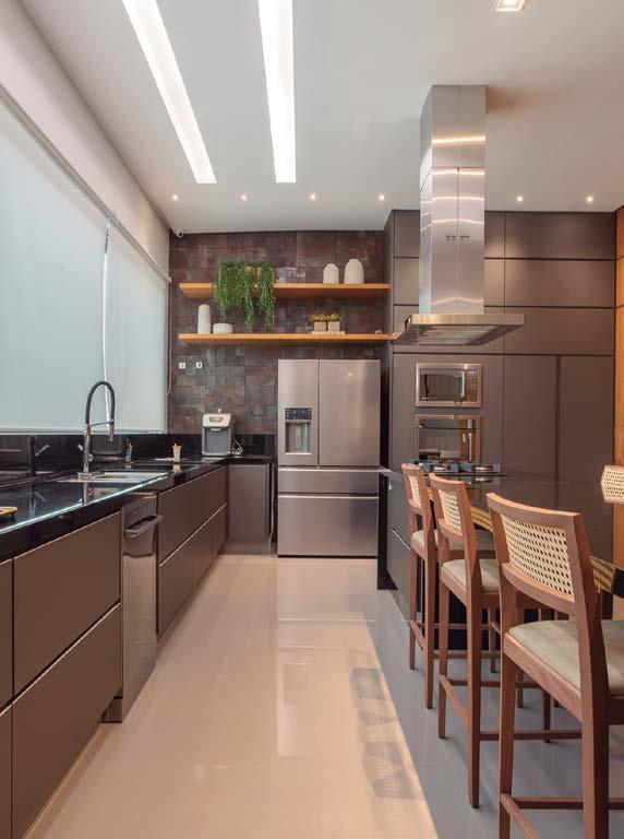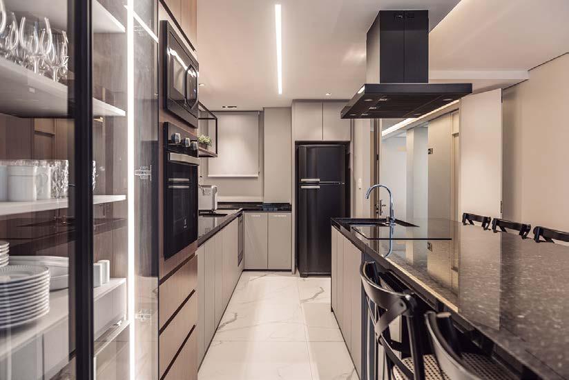 sta cozinha foi totalmente reformulada para atender ao desejo do cliente de usufruir do espaço de modo mais confortável e funcional, com conceito gourmet, integrado à área social. Para tanto, duas soluções: a incorporação de um dormitório de serviço que não era utilizado e a retirada de paredes de vedação que separavam a cozinha da área social. Novos revestimentos, marcenaria sob medida, tampos em granito, eletros, metais e móveis soltos também compõem o projeto de renovação. Ao rever os pontos de hidráulica e gás, foi possível fazer com que pia e cooktop ficassem em uma península, virados para a área social. Nas paredes, o revestimento Decortiles Beatles branco brilho é destaque. Os vidros reflecta fumê das portas dos móveis garantem sofisticação e leveza. A diversidade de materiais de cor escura (granito preto, vidro refletivo fumê, marcenaria em tom chumbo, palhinha e estofado preto das banquetas) traz dinâmica à paleta de tons monocromáticos. Embutidas nos armários aéreos, fitas led iluminam as áreas de trabalho das bancadas. O espaço de bar tem cristaleira iluminada e adega climatizada.