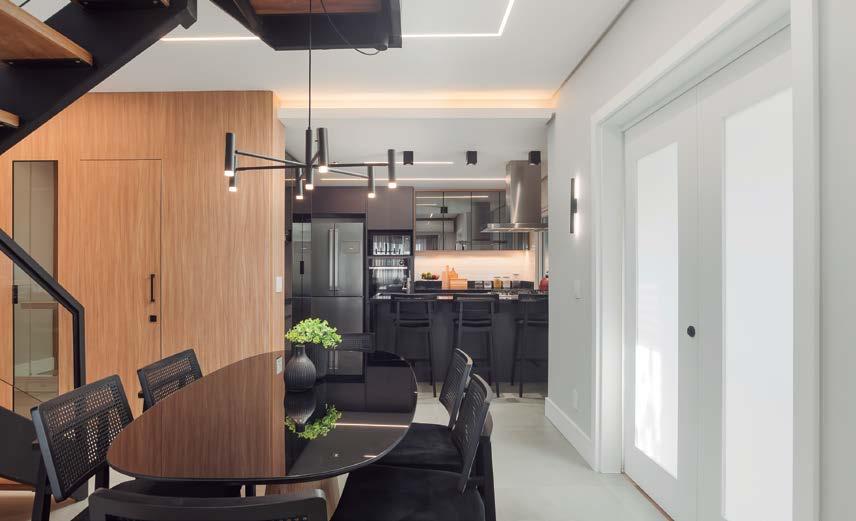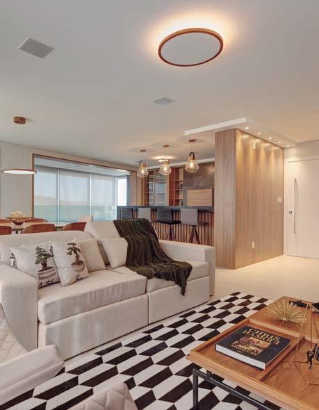 oderna, sofisticada, aconchegante e destacando a vista, já que se trata de um apartamento de cobertura: essas são as características mais marcantes do projeto. O cliente desejava um espaço integrado (que chega a 62 m²) e funcional, tanto para o uso diário quanto para os momentos de receber os amigos. A bancada é um bom exemplo dessa expectativa atingida: tem formato península, para que a área social fique central e possibilite aos clientes cozinharem junto aos convidados. Na varanda, o deck para receber o spa tem bancos virados para a parte interna da cozinha, outro detalhe pensado para acomodar visitas de modo mais acolhedor.