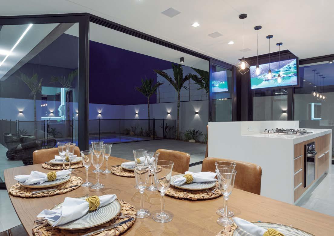 vidro é um dos destaques do projeto. A opção por esse material atende ao desejo do cliente de que pudesse apreciar a vista da área de lazer, estando na cozinha ou no sofá da sala. O espaço gourmet da residência se comunica com a área externa de 110 m², criando uma sensação de amplitude e liberdade.