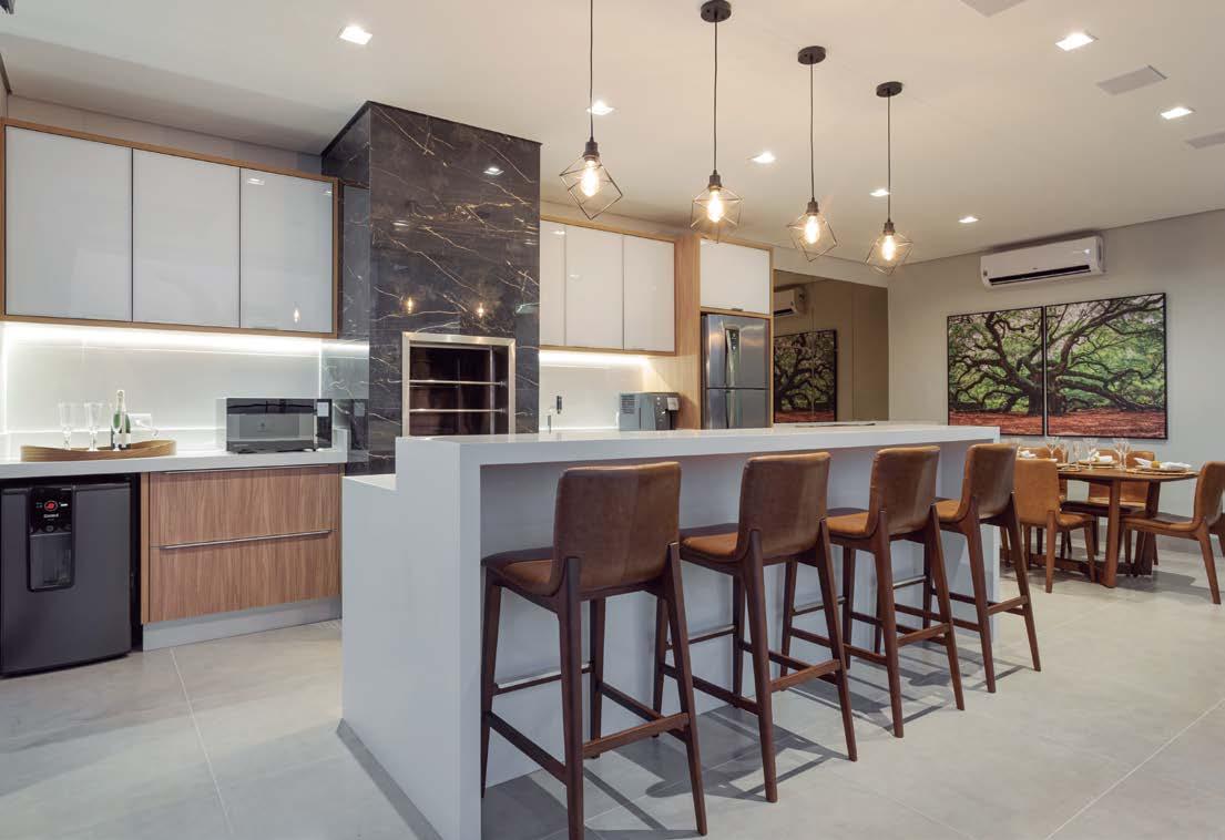A integração é a chave. O porcelanato cimentício e o revestimento na cor sertão (Castelatto) aplicados no espaço gourmet remetem à natureza. Ao explorar os tons claros, a cozinha tem personalidade contemporânea com elementos clássicos.
