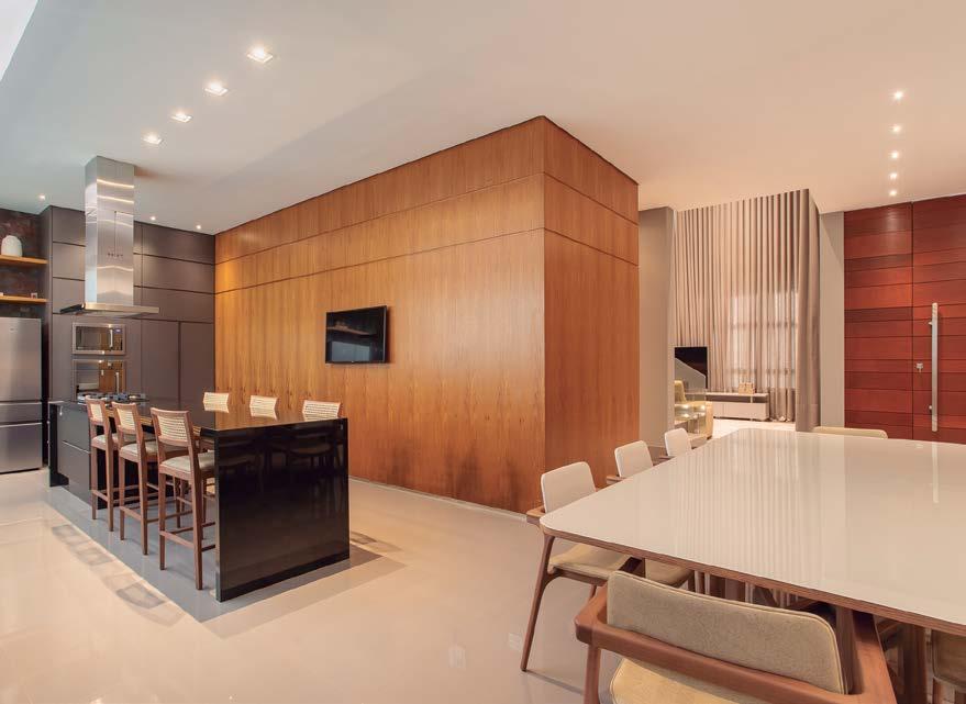 este projeto, a cozinha de 27 m² se integra à sala de jantar mas, ao mesmo tempo, garante privacidade aos outros ambientes – o que era um desejo dos clientes.