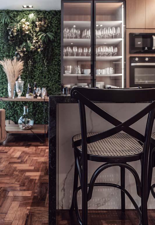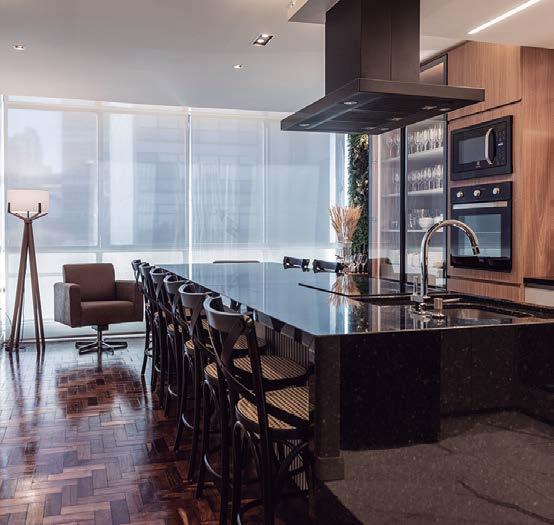 sta cozinha foi totalmente reformulada para atender ao desejo do cliente de usufruir do espaço de modo mais confortável e funcional, com conceito gourmet, integrado à área social. Para tanto, duas soluções: a incorporação de um dormitório de serviço que não era utilizado e a retirada de paredes de vedação que separavam a cozinha da área social. Novos revestimentos, marcenaria sob medida, tampos em granito, eletros, metais e móveis soltos também compõem o projeto de renovação. Ao rever os pontos de hidráulica e gás, foi possível fazer com que pia e cooktop ficassem em uma península, virados para a área social. Nas paredes, o revestimento Decortiles Beatles branco brilho é destaque. Os vidros reflecta fumê das portas dos móveis garantem sofisticação e leveza. A diversidade de materiais de cor escura (granito preto, vidro refletivo fumê, marcenaria em tom chumbo, palhinha e estofado preto das banquetas) traz dinâmica à paleta de tons monocromáticos. Embutidas nos armários aéreos, fitas led iluminam as áreas de trabalho das bancadas. O espaço de bar tem cristaleira iluminada e adega climatizada.