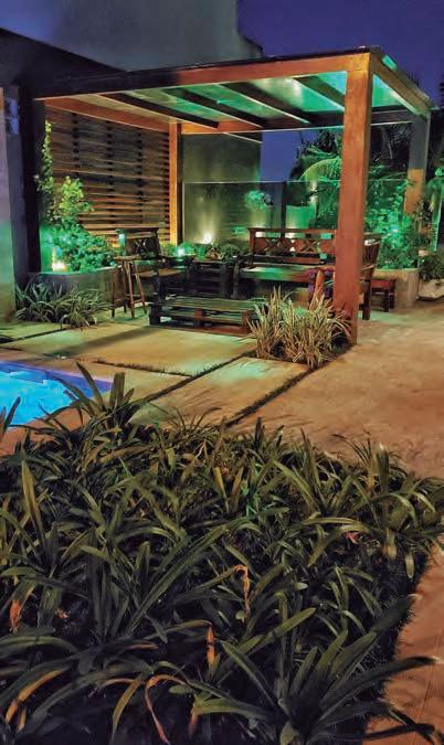 Ao lado, o pergolado traz sombra e aconchego. A valori zação do gramado deu-se pela mescla da grama com a área de piso, realçada por arbustos que florescem no verão. O projeto de iluminação foi cuidadosamente planejado para o perfeito uso no turno do espaço.