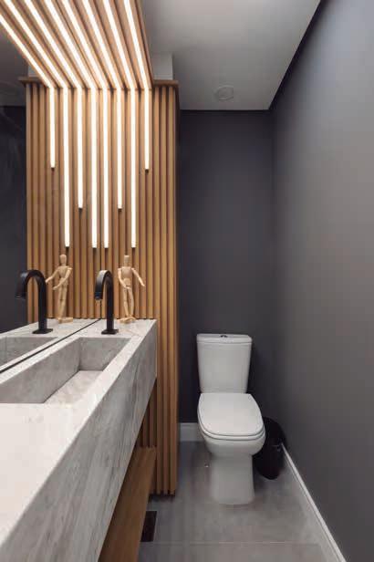 que, como um monobloco, divide e ao mesmo tempo integra os es paços. Outro destaque é o reves timento Moema, que logo no pri meiro contato visual se destaca e alegra a área de lazer.