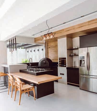 Odesafio arquitet nico do projeto desta área de lazer foi criar um espaço amplo que interligasse o exterior com o espaço gourmet da residência. As arquitetas montaram uma cozinha funcional revesti da com porcelanato cimentício e com o Adobe Moss na cor sertão, trazendo a presença simbólica de elementos naturais para o interior da casa.