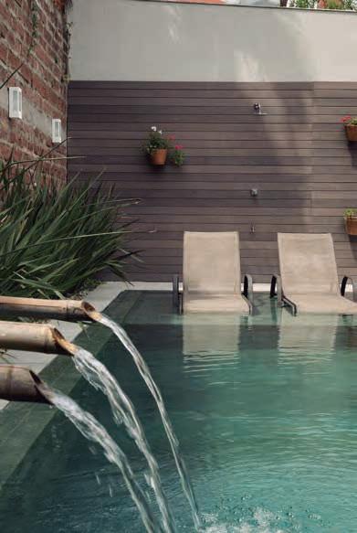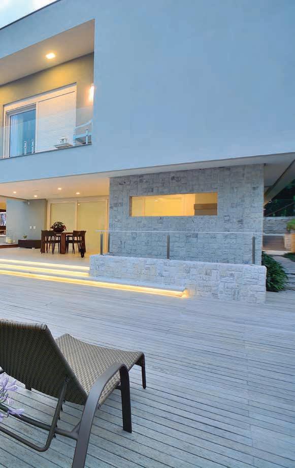 Este espaço foi projetado para que os moradores pudessem realizar o sonho de uma piscina suficientemente ampla para nadar e ainda reunir a família nos momentos de la zer. No seu entorno, o piso em porcelanato Giardino, 90x90cm, lembra um deck de madeira. Na parte interna da piscina, além da raia de 10x2m de largura, há uma “prainha”, com espaço para espreguiçadeiras e uma profundidade de apenas 20cm. Os degraus permitem maior co modidade de uso, enquanto a floreira – que está na divisa e de