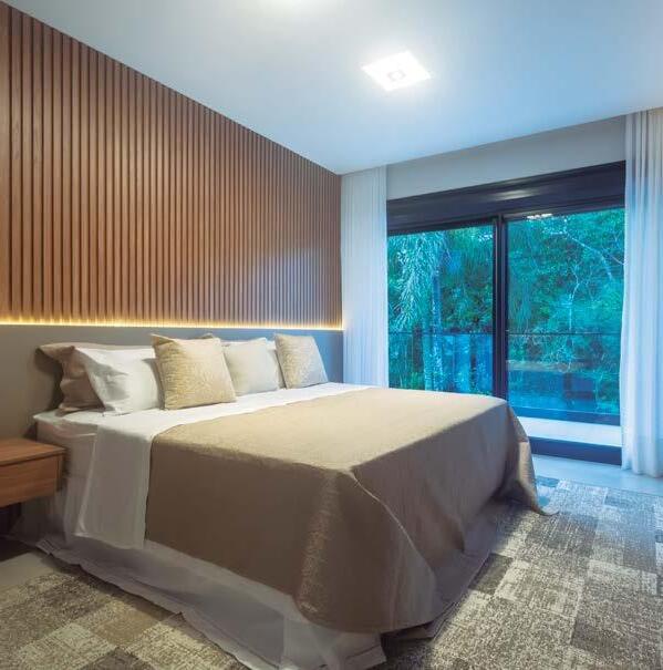 Com o ponto de partida definido, a etapa seguinte foi garantir que os ambientes oferecessem integração, sem abrir mão da possibilidade de fechamento. Assim, a copa, o espaço gourmet, a varanda e a área externa ficaram juntos. A possibilidade de escolha entre integrar ou isolar esses espaços agradou demais ao cliente. “No pavimento superior, distribuímos os quartos mantendo o vão com pé-direito duplo, deixando a suíte máster ao fundo, com vista para a piscina”, explicam. Os quartos maiores, para casal, ocupam as extremidades (frente e fundo), e os dormitórios centrais foram pensados para os filhos.