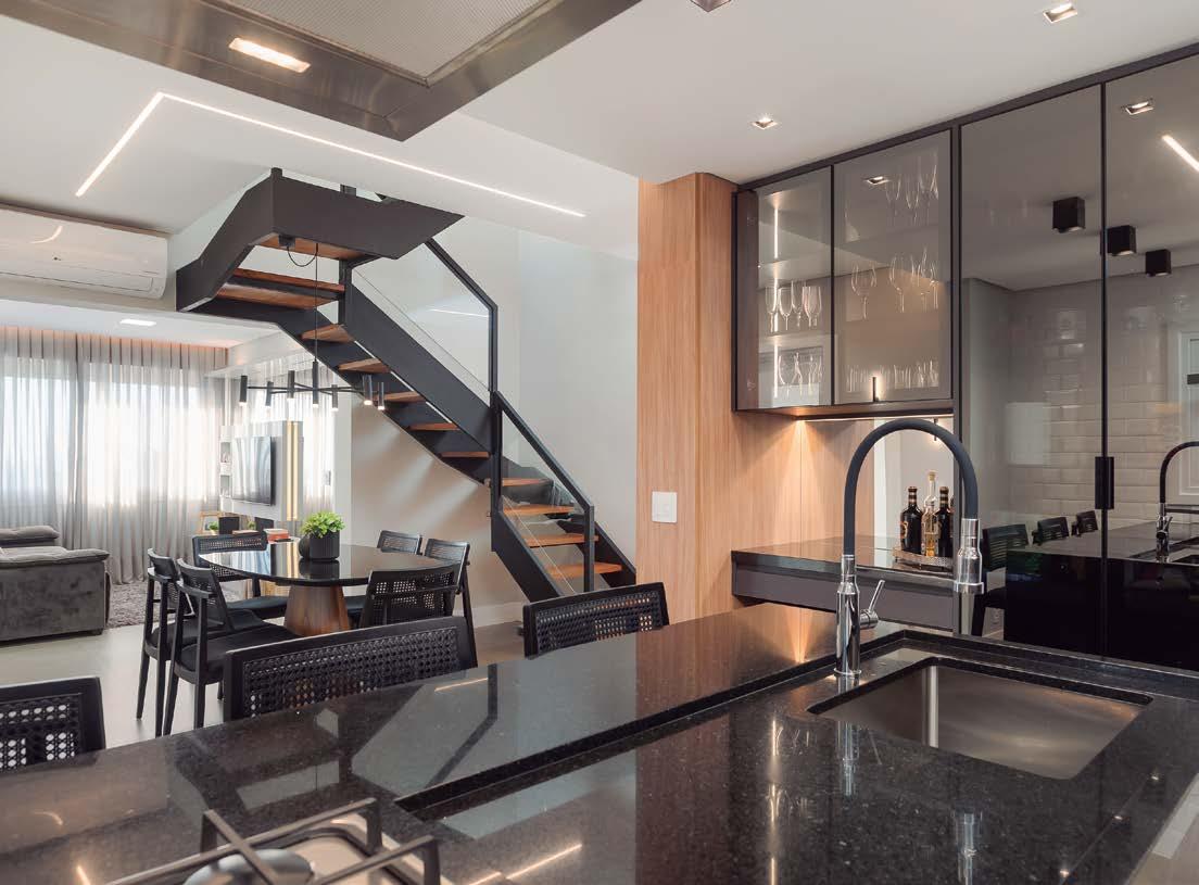 oderna, sofisticada, aconchegante e destacando a vista, já que se trata de um apartamento de cobertura: essas são as características mais marcantes do projeto. O cliente desejava um espaço integrado (que chega a 62 m²) e funcional, tanto para o uso diário quanto para os momentos de receber os amigos. A bancada é um bom exemplo dessa expectativa atingida: tem formato península, para que a área social fique central e possibilite aos clientes cozinharem junto aos convidados. Na varanda, o deck para receber o spa tem bancos virados para a parte interna da cozinha, outro detalhe pensado para acomodar visitas de modo mais acolhedor.