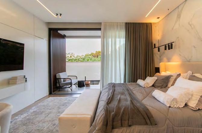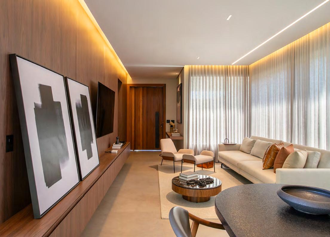 mesmos metais Rose Gold. Já no banheiro master, o destaque ficou por conta do Palazzo Ducale polido 81x140 cm, que sobressai no cenário, conferindo ao ambiente uma atmosfera de sofisticação e beleza.