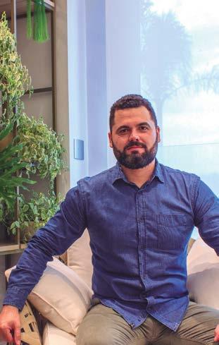 parede e o mármore bege Bahia levigado, no pilar. Também a escolha da iluminação teve papel fundamental no projeto, pois o processo de automação conseguiu criar ambientes diferenciados.