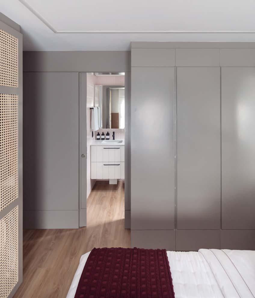 Na suíte a arquiteta optou por fazer a base da cama em marcenaria com tablado iluminado, que se interliga ao painel ripado em MDF fumê da cabeceira. O espaço abaixo da cama foi aproveitado para gavetas, já que um dos pedidos da cliente era um quarto com a máxima capacidade possível de armazenamento. Roupeiros com portas de palhinha trazem charme e modernidade para o ambiente. A bancada, com penteadeira oculta e luz frontal, transforma-se em espaço perfeito para maquiagem. O painel ripado conjuga todos os elementos, conferindo-lhes unidade e elegância.