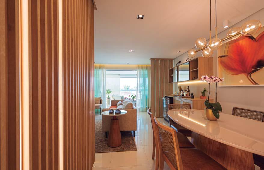 onviver harmonicamente e poder compartilhar as experiências familiares em um espaço funcional, confortável e dinâmico. Essa foi a premissa básica deste projeto. Originalmente o apartamento era composto por três suítes. A planta foi modificada, transformando o terceiro dormitório em estar íntimo integrado à área social. Agora, cozinha, jantar, estar, estar íntimo e churrasqueira se comunicam e possibilitam o convívio dos moradores. A ligação entre área social e íntima do apartamento se dá de forma circular: o acesso pode acontecer também pelo estar íntimo, facilitando a circulação.