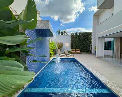 O quintal recebeu uma piscina com cerâmica em nuances de branco e cinza, 20x20 cm, e borda em granito preto São Gabriel lixado. O paisagismo foi reformulado para manter a casa em contato com a natureza e gerar privacidade em relação aos vizinhos. O cuidado com os detalhes, a escolha de materiais e cores, a luminotécnica bem elaborada e o planejamento voltado para transmitir acolhimento foram determinantes para que a casa se transformasse em um gostoso refúgio.