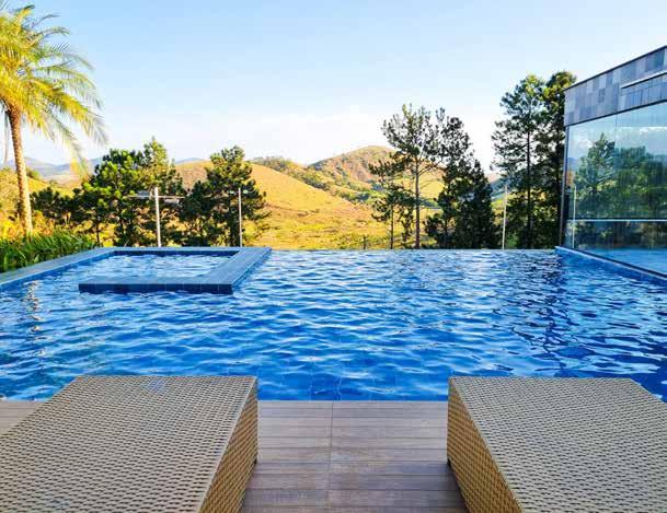 O projeto da área externa desta casa de campo foi desenvolvido para que seus moradores pudessem contemplar a bela vista do vale onde está localizada. Para isso, foram agregados três espaços - piscina, SPA e sauna - em um mesmo conceito. A piscina revestida em Jeri 20x20 cm foi planejada com borda infinita, para criar a ilusão da água se estendendo até o horizonte, fundindo-se com a paisagem. No deck foi usado o porcelanato amadeirado Legno Maso 60x60 cm.