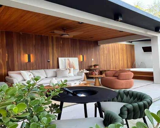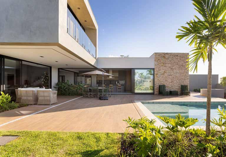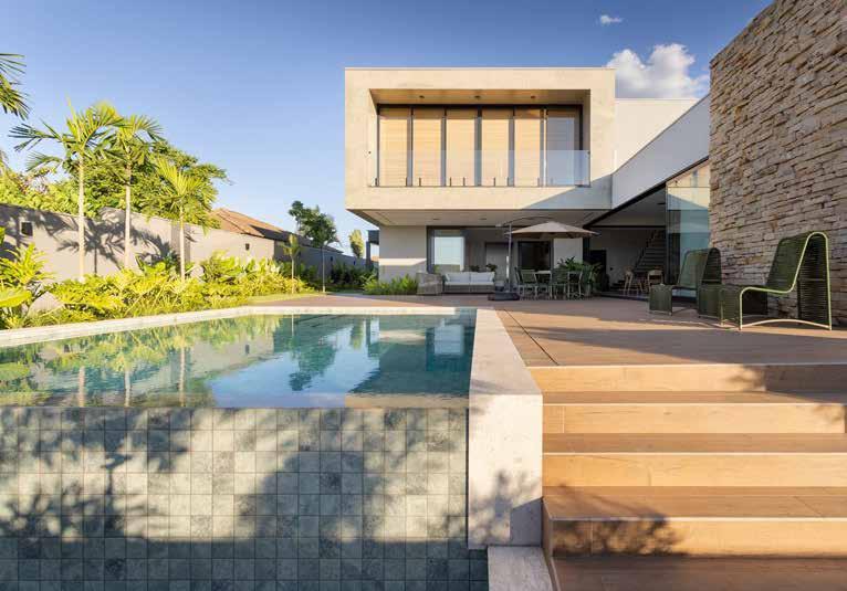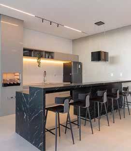 Neste projeto de reforma, o desafio era transformar um espaço pouco aproveitado em um verdadeiro refúgio de lazer. Os clientes desejavam um ambiente acolhedor, onde pudessem receber amigos, aproveitar momentos em família e criar memórias inesquecíveis. A proposta, então, foi integrar a área externa à residência, criando uma conexão harmoniosa com o amplo espaço gourmet. O Quartzito Mont Blanc tornou-se o material de destaque nessa área gourmet, revestindo a churrasqueira e sendo utilizado também na coluna e na bancada central. O material contracena bem com os detalhes em madeira e com o painel da TV, onde se aplicou o Ecobrick marfim 30x7x2 cm, trazendo a rusticidade da tradicional pedra esculpida. Já para o piso foi escolhido o Superquadra cru 120x120 cm, mantido na área externa, com o objetivo de estabelecer uma unidade visual. Na área ao ar livre, os pontos de atenção são a piscina revestida com pedra Hijau Lisa 10x10 cm e a cascata, que confere elegância e frescor ao ambiente. O deck de ipê e o paisagismo cuidadosamente pensado completam o cenário, envolvendo o espaço em uma atmosfera natural e convidativa. O resultado é um ambiente sofisticado e confortável, que estimula e torna extremamente agradável o lazer em casa.