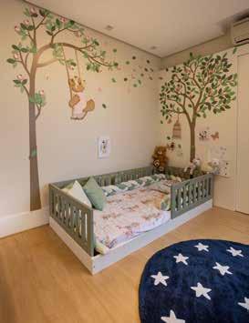 O quarto infantil foi todo pensado para atender às necessidades da filha de 3 anos. A cama montessoriana (mais baixa que as convencionais, para facilitar o acesso da criança e sua autonomia), a marcenaria em uma tonalidade de verde e as paredes decoradas constroem uma atmosfera lúdica e aconchegante.