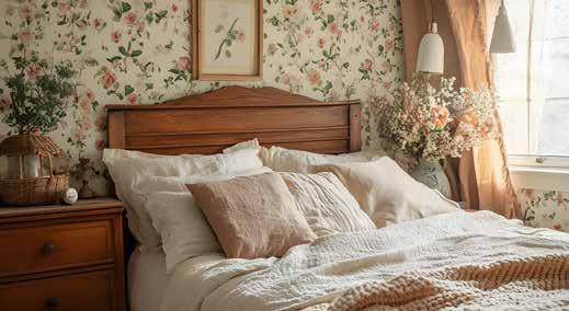 Papel de parede com estampas florais ou listradas. Pisos de madeira, cerâmica ou pedra, com tapetes de tecido macio.