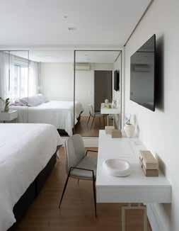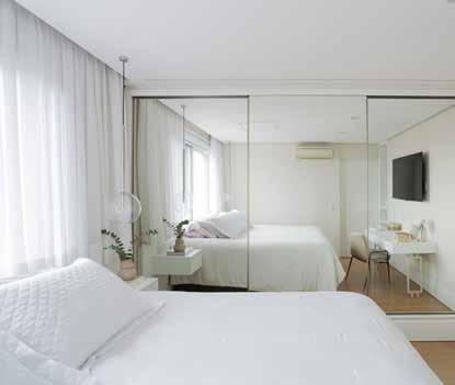 Nas áreas íntimas da residência, suíte do casal e quartos, foi aplicado o piso Vinílico Renaissance, para deixar os ambientes mais acolhedores. A suíte do casal acompanha a mesma linguagem do restante da residência, pelo domínio de tons suaves, linhas retas e painéis espelhados, que “ampliam” o ambiente. A penteadeira, posicionada em frente à cama, segue o mesmo design minimalista.