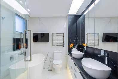 e a integração ao closet. A arquiteta criou várias soluções funcionais, como o toalheiro escondido no armário aéreo. Para o piso e as paredes do banheiro, ela escolheu o Michelangelo 60x120 cm, que contracena de forma elegante com a bancada em Granito preto Via Láctea Escovado.