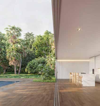 Para estabelecer um vínculo visual entre a varanda, a sala de estar e a cozinha, foi usado no piso o Shop Onyx Unique 90x90 cm. A mesa de jantar com oito lugares, em Quartzito Savana Escovado, reforça os tons claros e as linhas retas. É o mesmo revestimento utilizado na lareira, criando uma unidade decorativa. Um painel espelhado de embutir permite a conexão ou o isolamento da cozinha, de forma funcional e elegante. Na bancada, a Pedra Marrom Absoluto gera um contraste com o restante da área social, com a marcenaria branca e também com o revestimento da parede, o Shop Onyx Unique 120x120 cm.