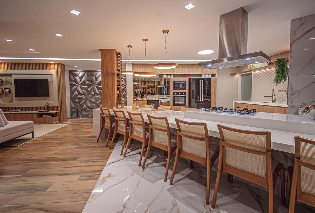 escolha dos revestimentos, a paleta de tons mais claros, o uso da madeira e o projeto de iluminação conferem um aspecto clean, atemporal e uma sensação de aconchego para esta cozinha de 30 m². Os clientes buscavam um ambiente moderno e sofisticado, com foco em funcionalidade. A triangulação de geladeira, cuba e fogão, além da opção por itens embutidos, como lixeira, calha úmida e fruteira, atende a esse desejo. Também por isso a presença de grandes bancadas e de muitos armários no ambiente, que se integra à área gourmet. O porcelanato Onix 1,20x1,20 m das bancadas contribui para a sensação de elegância. Destaque para a combinação de iluminação indireta, ótima para os momentos de refeições, e iluminação direta, própria para o preparo de alimentos, por meio de placa de led e de perfil de led embutido no armário.