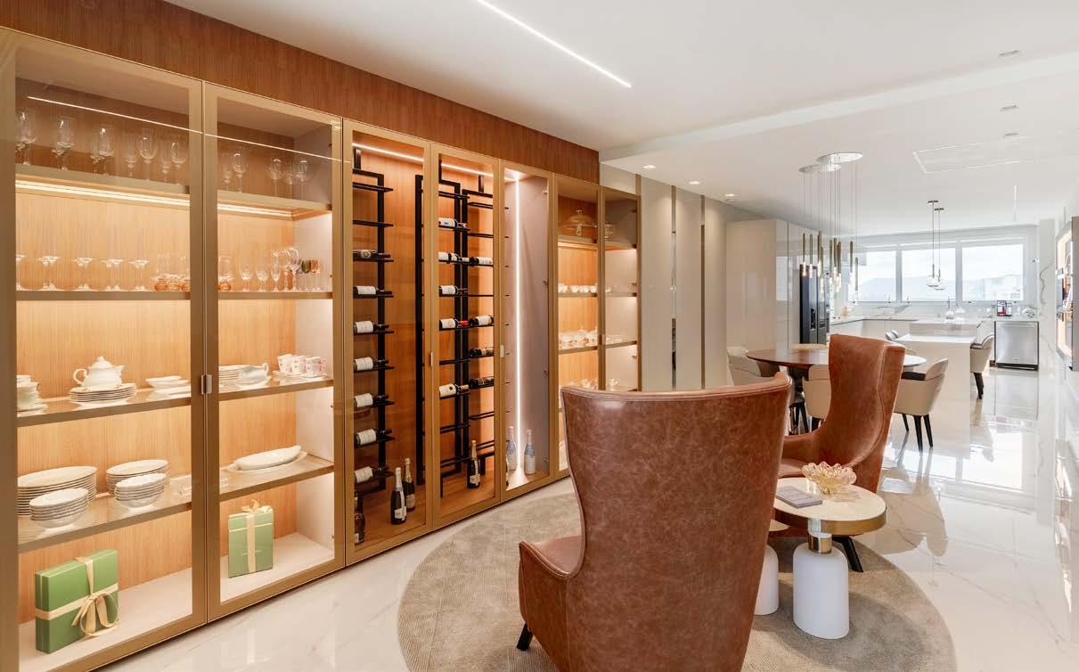 sta cozinha foi concebida para atender às necessidades de um casal jovem, moderno, com duas meninas. Julio Teroni focou no estilo de vida dinâmico da família, buscando soluções práticas para o dia a dia. Era preciso unir funcionalidade e sofisticação em um espaço com estética contemporânea e clean. A escolha por superfícies lisas, cores claras e materiais nobres foi uma decisão estratégica para criar a sensação de amplitude e elegância. No piso foi aplicado o Santorini Bianco Lux 120x120 cm, já a parede da bancada e a parte inferior da ilha receberam a pedra Calacata, com seu efeito marmorizado. Destaque especial cabe à cristaleira com portas de vidro e iluminação embutida. O acabamento interno em madeira e metal cria um contraste sofisticado com o vidro, enquanto o sistema de iluminação valoriza as peças expostas, além de acomodar a adega de vinhos de forma prática e charmosa. O projeto luminotécnico tem um mix de luzes embutidas no teto e luminárias suspensas. Os pendentes, além de auxiliar na divisão visual dos ambientes, dão um toque de charme ao conjunto. A luz indireta sob os armários superiores produz uma sensação de aconchego e valoriza o revestimento das paredes. A linguagem contemporânea é marcante pela adoção de linhas retas, acabamentos em tons neutros e pelo uso de materiais como mármore e metais. Juntos, compõem uma atmosfera refinada e atemporal.
