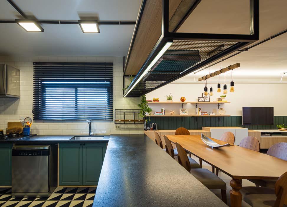 rocurando seguir o perfil alegre e descontraído da proprietária, que gosta de cozinhar e receber familiares e amigos, a arquiteta idealizou uma cozinha aberta, integrada à sala, de tal forma que o cooktop e a área de preparo dos alimentos ficam voltados para a área social, facilitando o convívio.