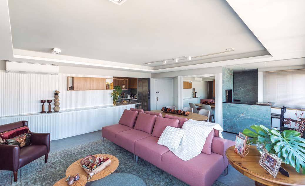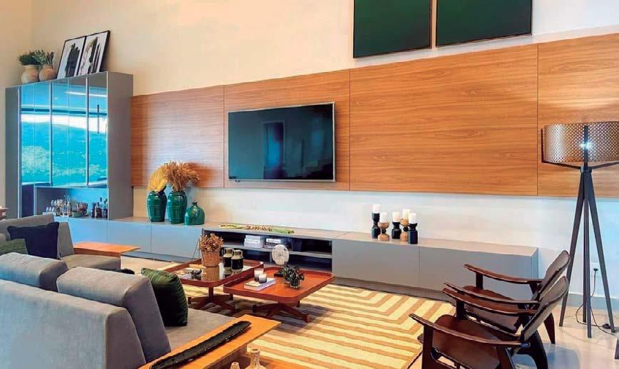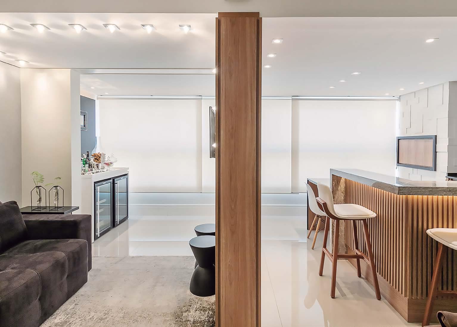 O painel ripado em MDF com acabamento em laca branca também traduz a sofisticação característica dos clientes, já que conecta todo o ambiente social e estabelece um pano de fundo para a decoração e as peças artesanais autorais. Além disso, possibilita a mimetização da porta do lavabo e da cristaleira. Seguindo essa mesma linha, o piso vinílico Montelupo concreto, 91x91 cm, complementa a base da ambientação, imprimindo maior singularidade ao ambiente.