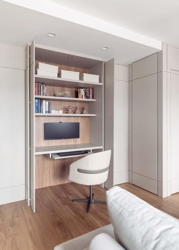 O espaço de home office está totalmente conectado à sala de estar e à cozinha, mas o revestimento em MDF no tom areia permite ocultá-lo quando não está sendo usado. Na sala destaca-se, além do sofá e chaise para assistir TV, uma poltrona confortável para momentos de leitura e relaxamento perto da lareira –também revestida no mármore Monet Supremo.