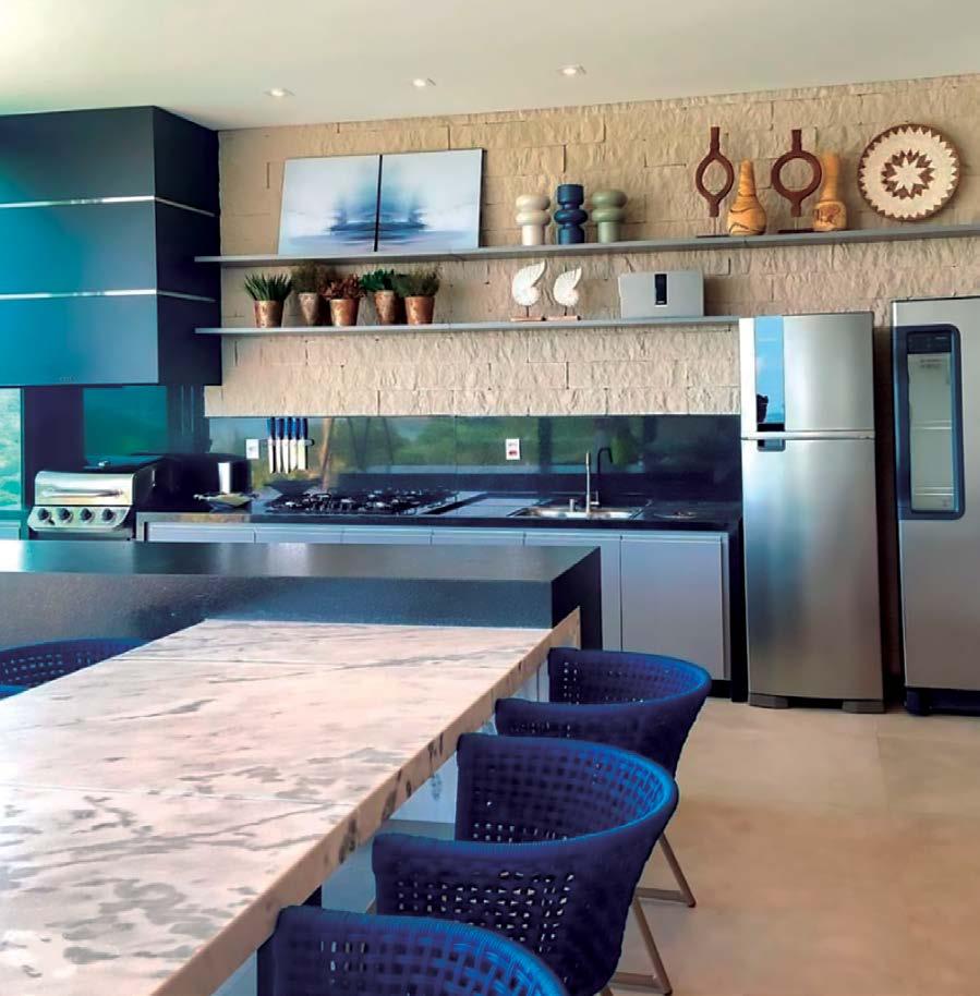 Com foco nesses pedidos, a arquiteta priorizou a cozinha e projetou uma grande ilha em Monet Supremo, que funciona também como mesa de jantar, permitindo a quem estiver cozinhando interagir com os convidados. Parte da viga que existia nesta peça foi retirada e rebaixou-se o gesso para que formasse uma prateleira, demarcando a área da bancada e finalizando na cristaleira. A arquiteta trabalhou com iluminação focal.