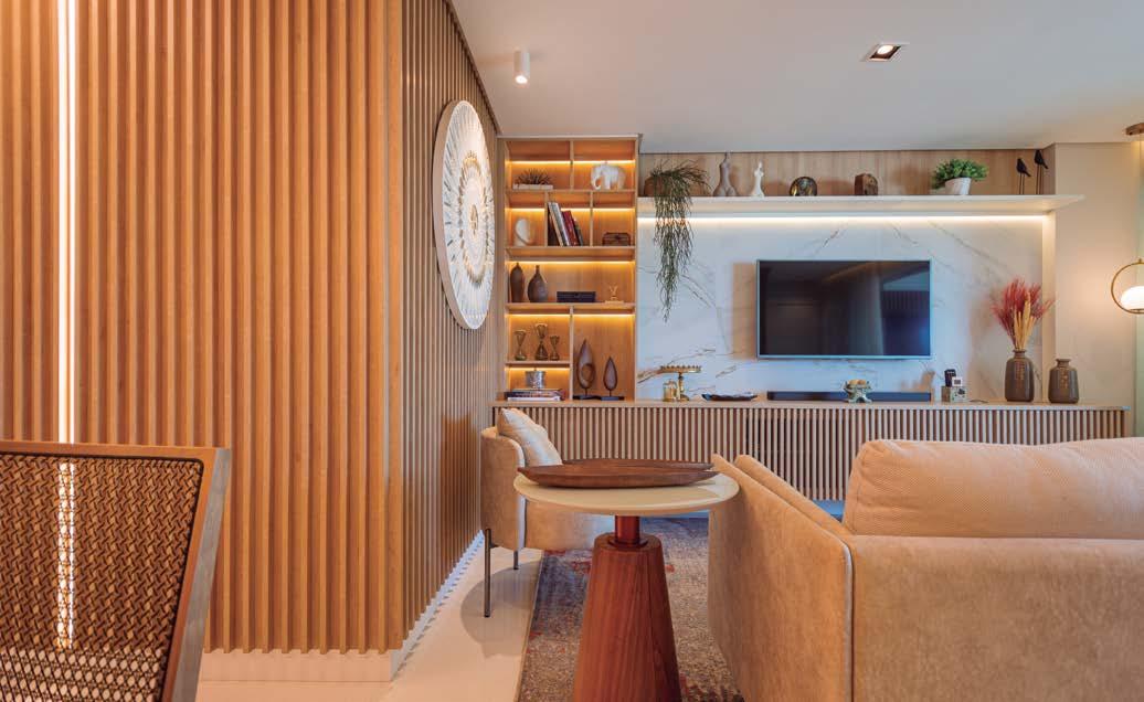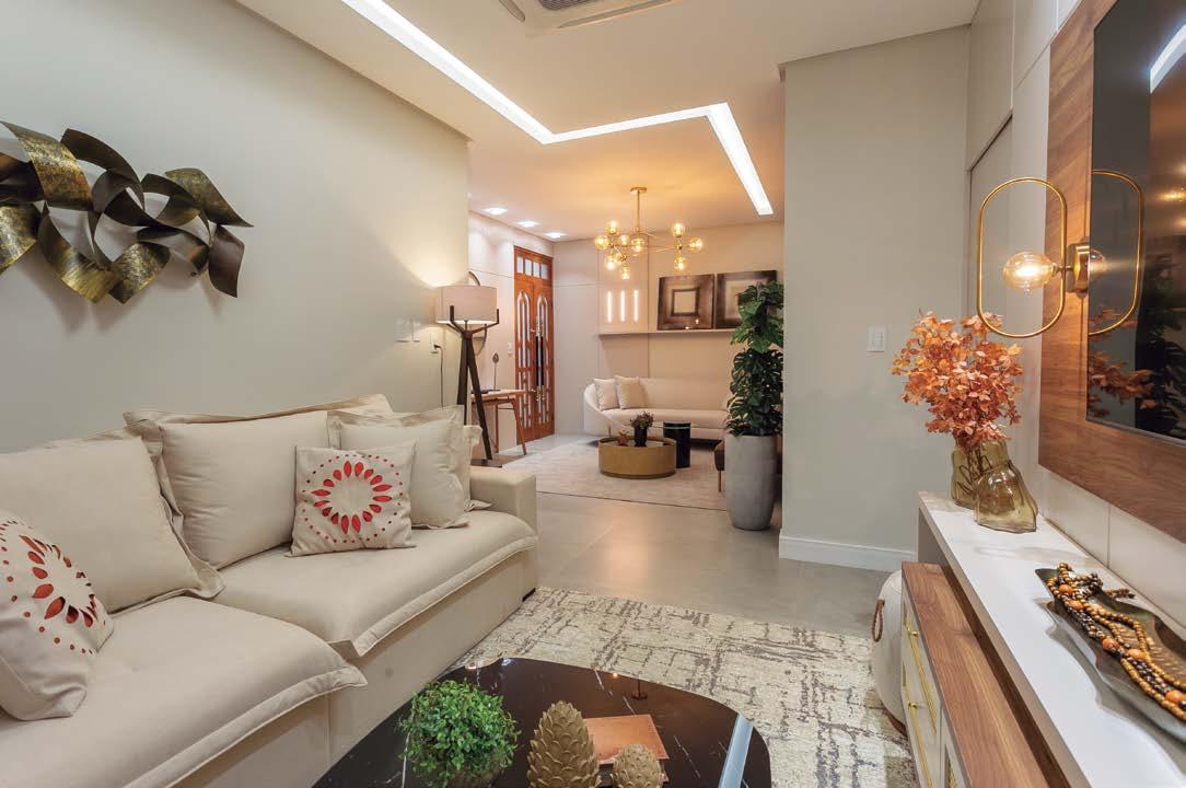 A atmosfera aconchegante é garantida pela paleta de tons terrosos, indo do off white aos tons de beges, marrons e dourados, presentes na marcenaria, nos tecidos e peças soltas, que compõem um conjunto decorativo harmonioso e agradável.