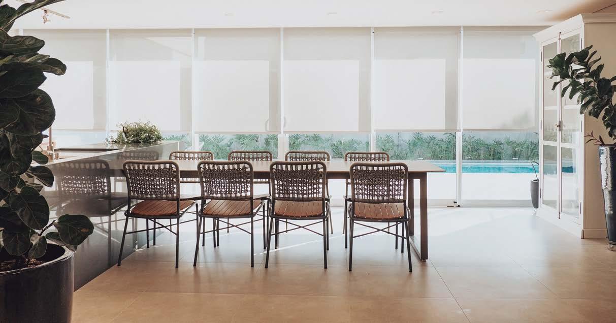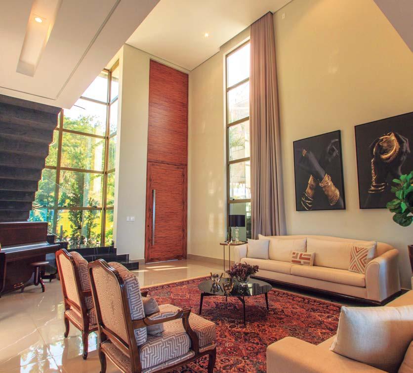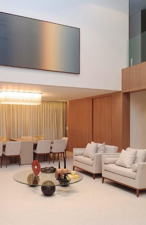 s clientes buscavam um projeto que oferecesse decoração harmônica para um espaço integrado por sala de estar, jantar e cozinha, transformando-o em uma área suave e acolhedora. Com o objetivo de acentuar a leveza da proposta, a profissional optou por um estilo mais clean, com tons neutros, madeira, vidro. O pé direito duplo e as amplas aberturas agregam sofisticação.