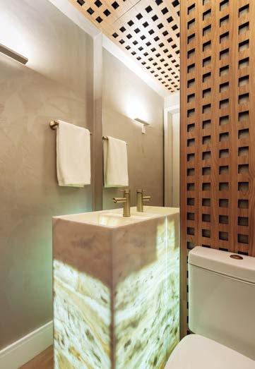 O lavabo é um encanto à parte, com suas paredes e forro trabalhados em textura velvet, muxarabis e a cuba retroiluminada em Mármore Savana. A iluminação do ambiente ficou por conta das arandelas. São detalhes que, juntos, produzem uma atmosfera de requinte e bom gosto. No banheiro da suíte também houve um cuidado especial com a iluminação. Por isso, os armários aéreos têm perfis de led embutidos. Na parede, o revestimento rose brilho Krea Miami, 10x40 cm, segue a linguagem alegre, descontraída e simultaneamente delicada, em contraponto com os metais pretos. Para reforçar a presença do preto, a serralheria do box também foi executada na mesma tonalidade escura.