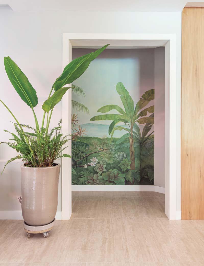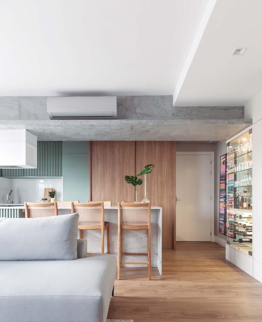 todos os eletrodomésticos são embutidos, inclusive a geladeira. Já a ideia de estabelecer um contraponto à marcenaria delicada e clarinha, na cor verde-jade, motivou o uso de uma linguagem industrial, traduzida na textura de cimento queimado que deu vida e personalidade ao forro deste espaço. Por sua vez, a circulação foi demarcada com o perfil iluminado, que inicia no hall de entrada e adentra a cozinha. O elemento de uniformidade aplicado em todo o apartamento é o piso vinílico Papoula, 20,8x123 cm.
