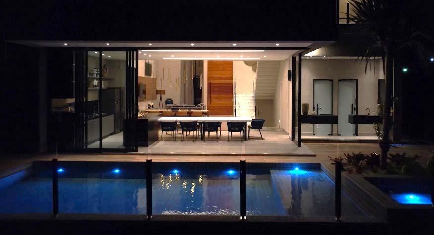 A escolha do piso em uma tonalidade neutra e com acabamento polido, 90x90 cm, Avorio di Brescia, estabeleceu harmonia com o revestimento da parede da sala de jantar, o Black Lava, 20x20 cm, de superfície texturizada, oriunda de erupções vulcânicas da Indonésia. Peça que igualmente foi aplicada na churrasqueira, junto com o granito Kouros, utilizado também para revestir a lareira, abaixo do painel da TV, onde se adicionou um ripado em MDF, tonalidade grafite.