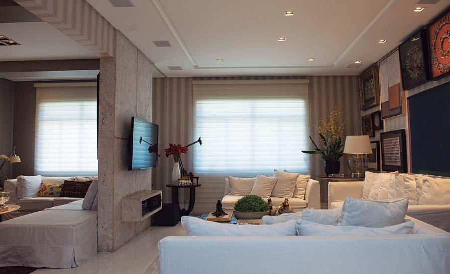 As cores clássicas e neutras predominaram e o porcelanato Onix Bianco Lux, polido, 90x90 cm, com rejunte acrílico platina, foi aplicado em todo o piso. Destaque nesta sala de estar cabe ao painel que receberá a TV, feito em MDF Titânio da linha Cristallo e Carvalho Malva da linha Design.