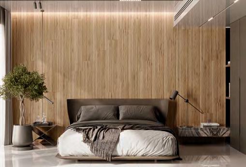 mesmos metais Rose Gold. Já no banheiro master, o destaque ficou por conta do Palazzo Ducale polido 81x140 cm, que sobressai no cenário, conferindo ao ambiente uma atmosfera de sofisticação e beleza.