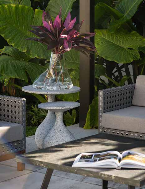 queimado. Já a divisória, revestida com ladrilho hidráulico Savona 60x60 cm, vai além da separação visual. Posicionada atrás da bancada e do forno de pizza, ela também atua como plano de fundo decorativo. Os ladrilhos hidráulicos, com padrões geométricos e florais em tons neutros, conversam com a rusticidade da madeira, o concreto da bancada e a estrutura de tijolos e telhas. Na varanda foi usada uma paleta de cores quentes e orgânicas. A cor marrom queimado do revestimento Iron 60x120 cm se aproxima do Aço Corten e harmoniza com o piso escuro em Madeira Slot Castanheira 20x100 cm, que reproduz a textura e a aparência da madeira natural. No coração do projeto, o lago artificial se destaca como ponto de contemplação e conexão com o entorno. Ele atua como espelho d’água que reflete a paisagem e a arquitetura, reforçando a harmonia entre o natural e o construído. Em seu entorno, os espaços convidam à permanência e ao descanso.