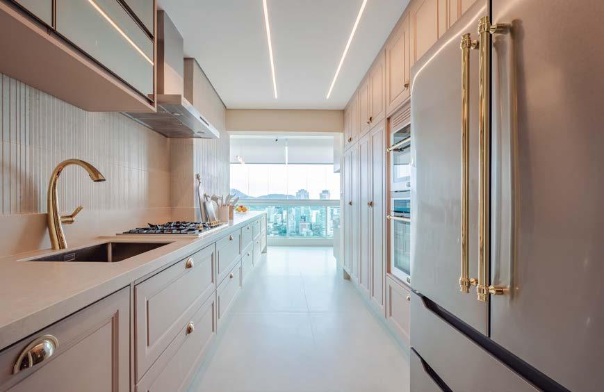m dos principais desejos do cliente era aumentar o espaço (que agora chega a 13 m²) e obter um ambiente mais moderno. Para isso, o projeto separou a área de bancada da área de armários, garantindo mais amplitude. Outro detalhe importante são as réguas no piso no assentamento espinha de peixe (régua Carvalho Natural 26x106 cm reta Biancogres). A disposição do piso cria um direcionamento que guia o olhar e valoriza o comprimento do ambiente. O pé-direito baixo era um desafio, superado com a escolha das cores claras, que geram sensação de amplitude. A profissional também optou por não usar armários superiores sobre a bancada. A harmonia nos acabamentos usados, em diferentes formatos, alcança o aspecto moderno desejado pelo cliente. Entre as peças eleitas estão o porcelanato Calacata Lux 82x82 cm Biancogres e o revestimento Paris Blanche 10x20 cm Portobello.