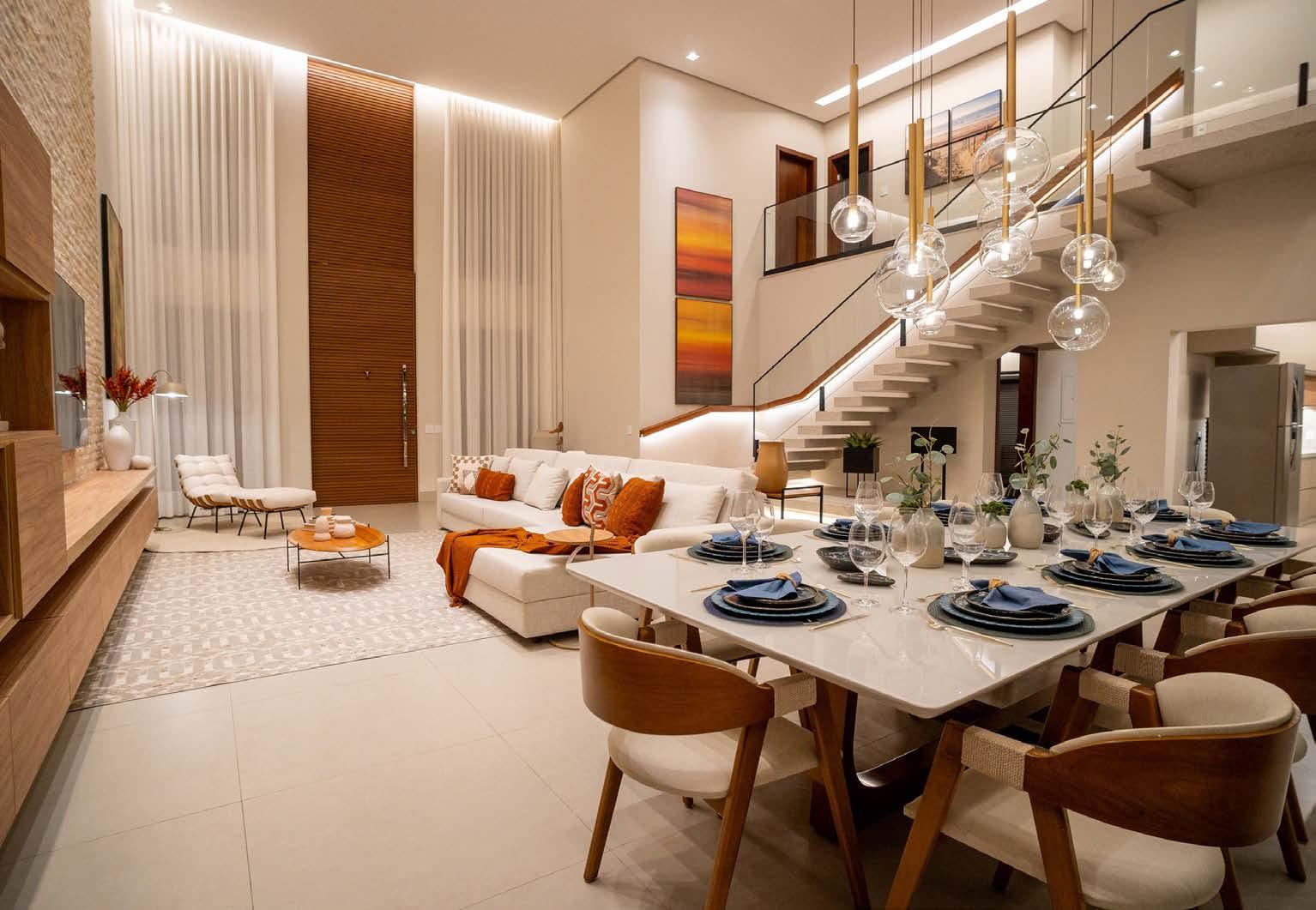 TODA A ATMOSFERA DA CASA É RECEPTIVA E ACOLHEDORA, COM ILUMINAÇÃO CONFORTÁVEL