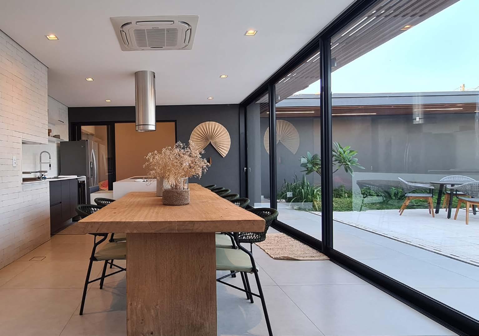 evido à vida agitada dos moradores, a ideia era que a casa passasse a ser um refúgio de descanso e lazer, para que a família e também os amigos pudessem usufruir do bem-estar propiciado por um espaço acolhedor. Para isso, os clientes solicitaram a integração entre o espaço gourmet e a área de lazer externa.