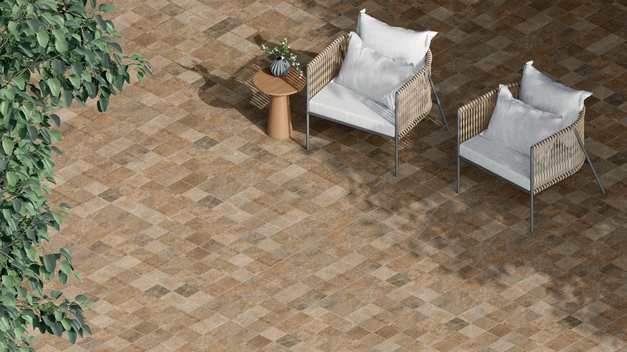 na, com seu acabamento Fiji em tons de verde, 20x20 cm, harmoniza com o paisagismo, sendo que o seu entorno recebeu a pedra atérmica cimentícia, 50x50 cm. A ala gourmet se destaca pelos tons neutros, especialmente com o piso York SGR 87x87 cm, tornando-se o coração da casa, o lugar ideal para receber amigos e familiares. O paisagismo emoldura a edificação com plantas que trazem vida e frescor. Por sua vez, a pérgola converte-se no centro das atenções dos convidados, atraindo olhares e proporcionando um agradável espaço para relaxar e socializar.